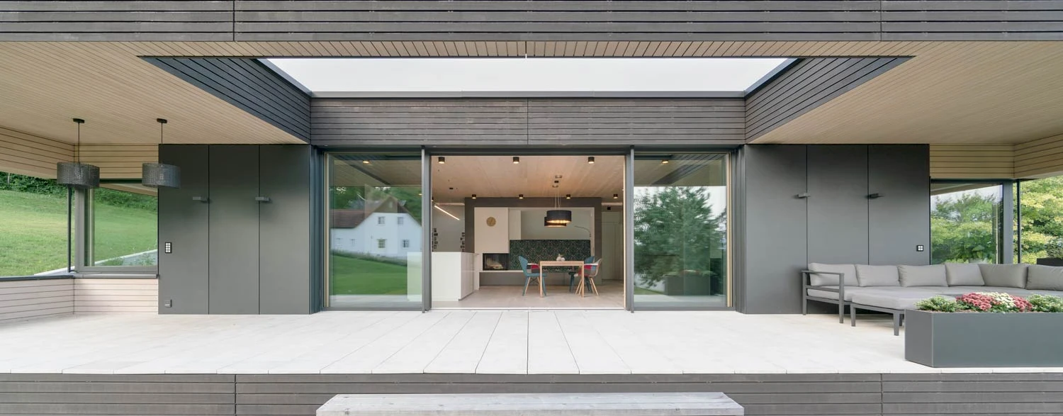 Die großzügige Veranda verbindet den zentralen Wohnraum mit dem Garten und bietet einen überdachten, sozialen Außenbereich. Eine großer Ausschnitt im Vordach bringt viel natürliches Licht in Haus und teilt die Veranda räumlich in zwei überdachte Bereiche. Eine großzügige Schiebetür öffnet den Hauptwohnraum zum Außenbereich und verbindet Innenräume mit der Umgebung.