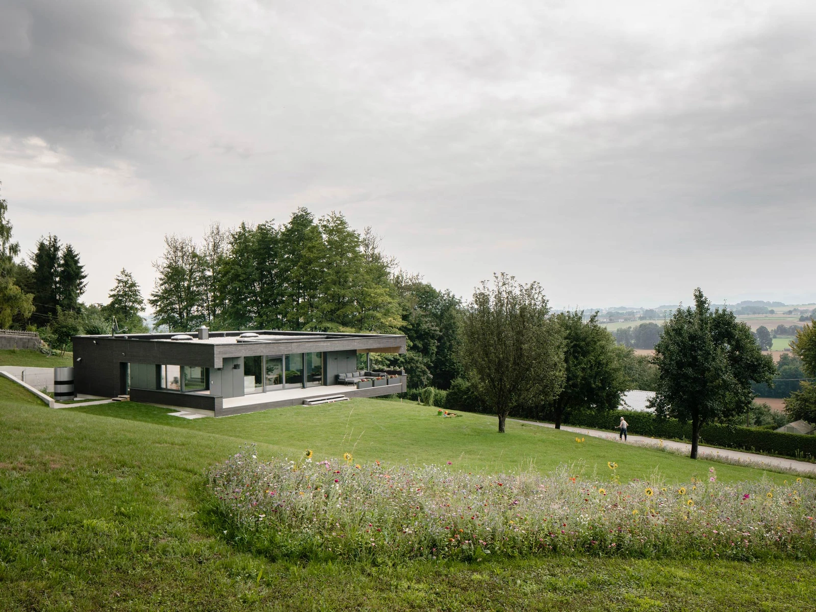 Villa Marie liegt an einem südorientierten Hang im Voralpenland Oberösterreichs. Der Entwurf konzentriert sich auf zwei Aspekte: Ein Bungalowkonzept, organisiert alle Zimmer auf einer Ebene um einen zentralen Wohnbereich, und eine westlich orientierte Verandaterrasse.