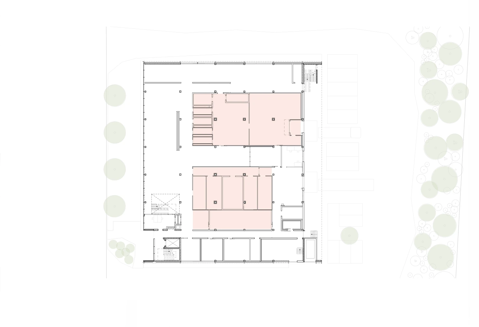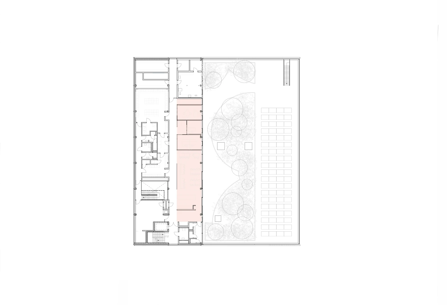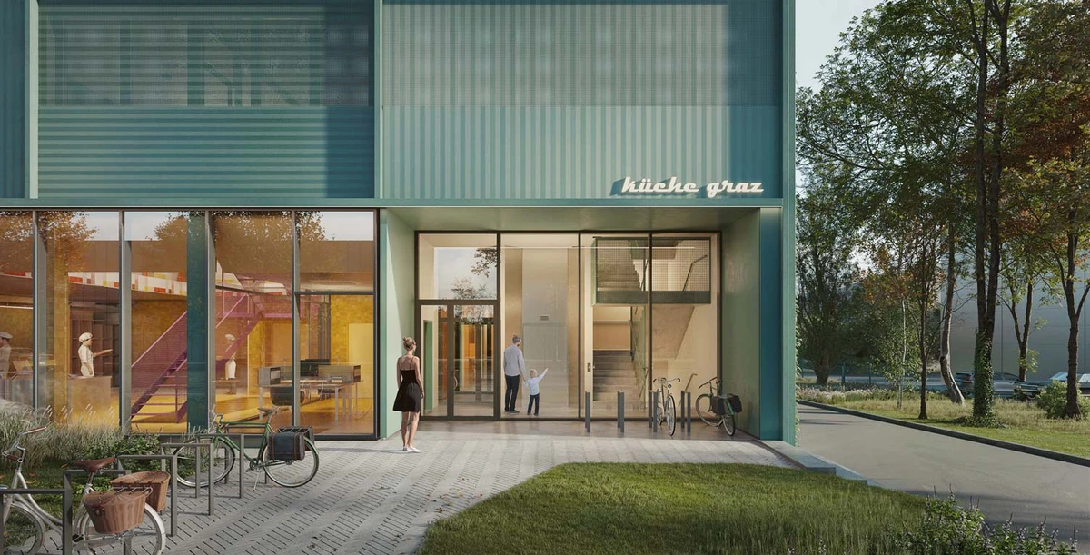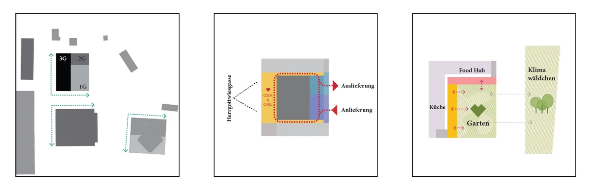 The ground floor is optimized for maximum functionality of the kitchen workflows. Goods are delivered from the east and fed into the circulation shown on the floor plan. On the opposite side, the meal preparation area is showcased as a "show kitchen" with large windows facing Herrgottwiesgasse. Furthermore, hermetic building opens up to the multifunctional garden space on the upper floor through floor-to-ceiling glazing.