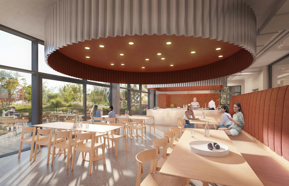 The garden on the upper floor nearly doubles the area of the climate grove, returning valuable green space and tree plantings to the surroundings. A nature-inspired planting concept, combined with the possibility of vegetable cultivation and versatile furnishings, allows for a diverse range of everyday uses, as well as celebrations, sports activities, relaxation, and more. To further enhance the green space factor, additional ground-connected facade greening is planned.