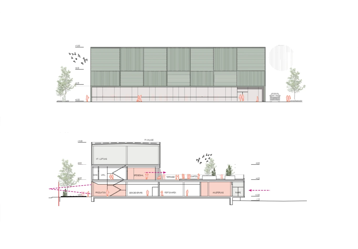 The building's primary structure is designed as an adaptable concrete framework. The load-bearing components consist of reinforced concrete columns and reinforced concrete slabs, forming a solid, durable, and versatile structure. The facade and interior design are designed as lightweight constructions, allowing for easy adaptation to changing uses. Materials are used according to their respective performance capabilities. Dismantling, cradle-to-cradle, and recycling play a key role. Furthermore, reuse or upcycling of used materials is also planned, e.g., roof panels, parquet flooring, reclaimed wood in the interior, etc.
